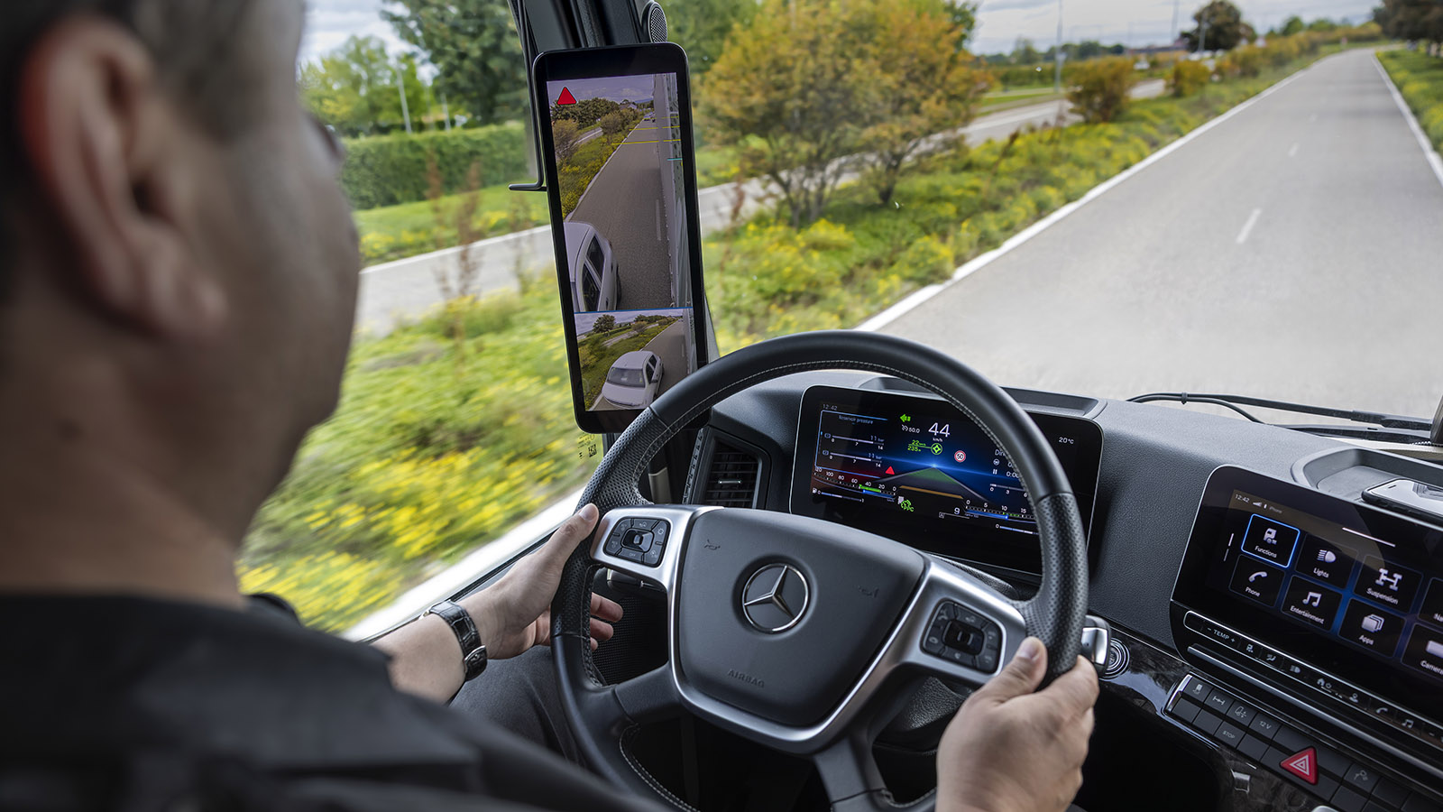 το Actros L φέρεται να καλύπτει κι εδώ ένα ευρύτατο φάσμα από λειτουργίες, που βοηθούν τους οδηγούς να αναγνωρίζουν έγκαιρα τους κινδύνους και να φρενάρουν εγκαίρως, εστιάζοντας στην καταπολέμηση της κόπωσης, του άγχους ή της απόσπασης.