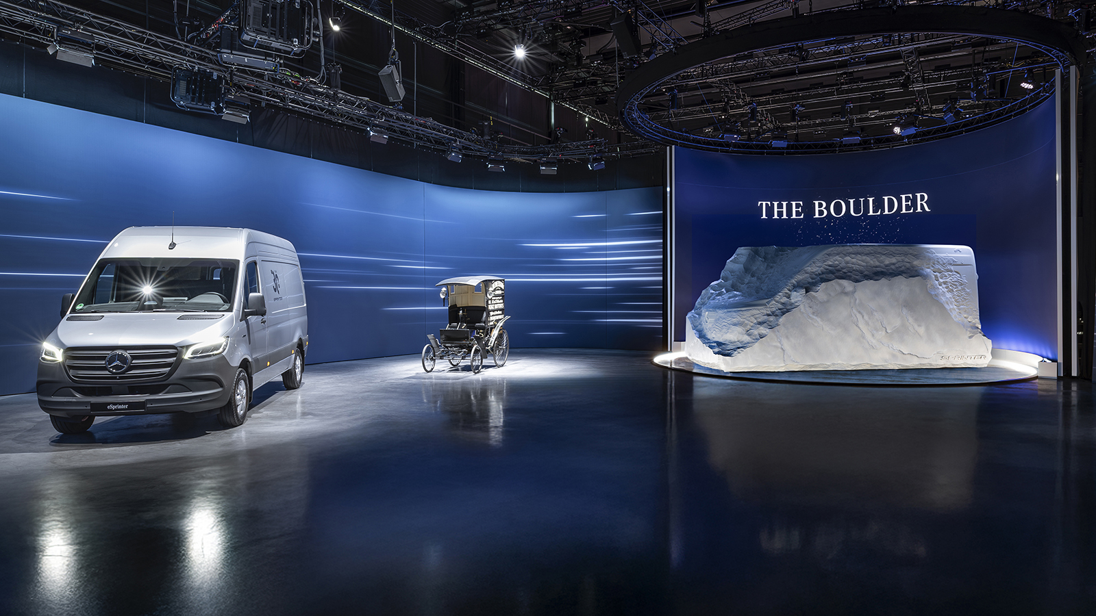 Το εντυπωσιακό γλυπτό που αποκάλυπτε μέρη της «σιλουέτας» του νέου Sprinter συνόδεψαν το υπάρχουν eSprinter (αριστερά) και το 1ο όχημα διανομών που κατασκεύασε ο Carl Benz, πίσω στο 1896!